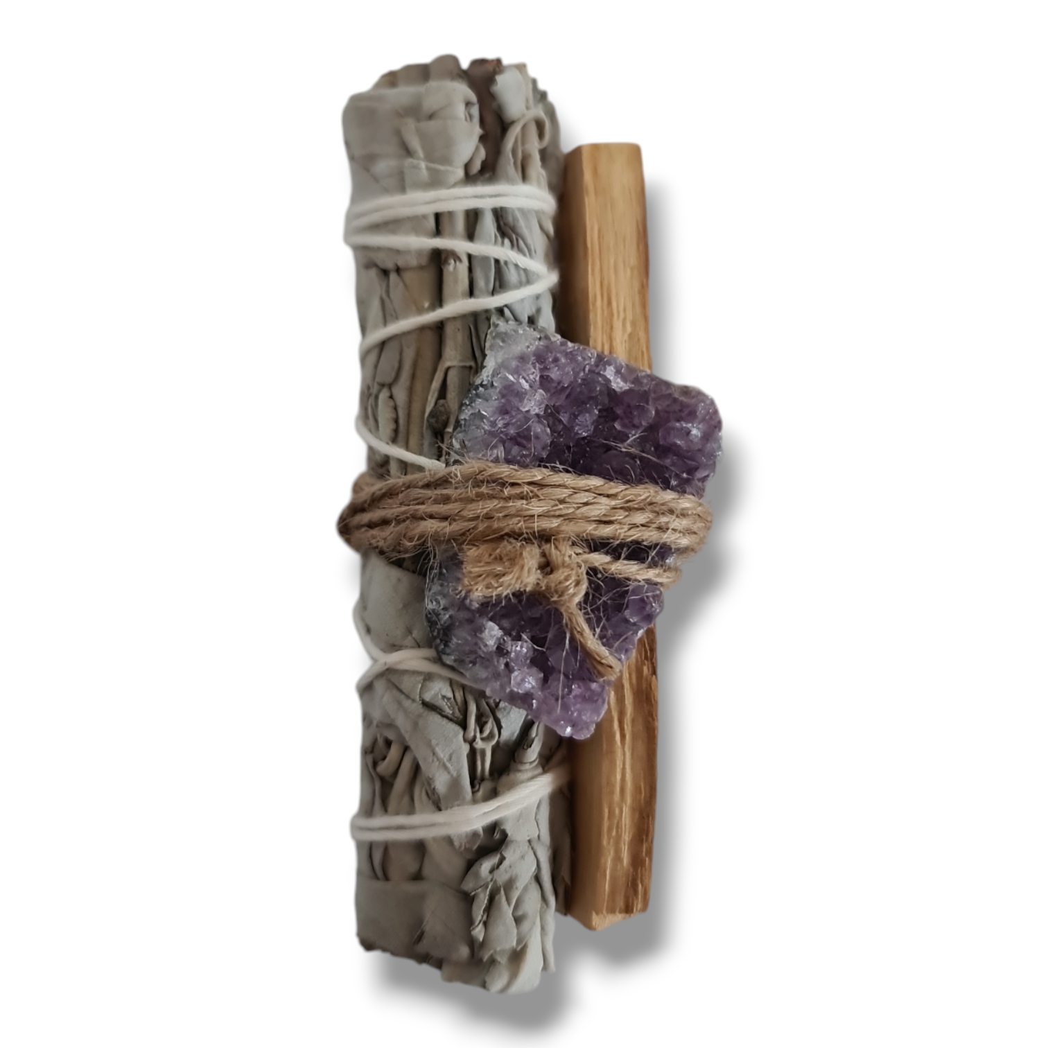 Cleanse your space and invite positive energy with our carefully curated smudge kit. Featuring ethically sourced Palo Santo and sage, these natural tools help purify your environment, while the calming presence of an amethyst cluster promotes tranquility and spiritual clarity. Whether you’re setting new intentions or clearing away negative energy, this kit provides everything you need for a meaningful cleansing ritual. Perfect for meditation, energy healing, or creating a peaceful atmosphere in your home.
